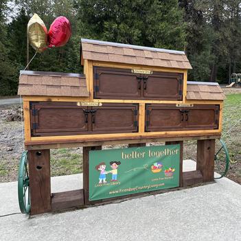 Building on the concept of the Little Free Library Program, a bigger box replaced the original two LFL boxes and a third was added to use for summer produce, canned goods, and little surprises! Thank you to the Roundhouse Foundation for awarding FCL a Small Grant to build this structure.